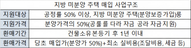 ‘환매조건부 지방 미분양 주택 매입’ 사업은 허그가 준공 전 미분양 주택을 분양대금의 50%, 절반 이내에서 매입해 건설사에 일정기간 유동성을 지원하는 정책이다. 해당 건설사는 준공 후 1년 내 해당 주택을 재매입할 수 있다.