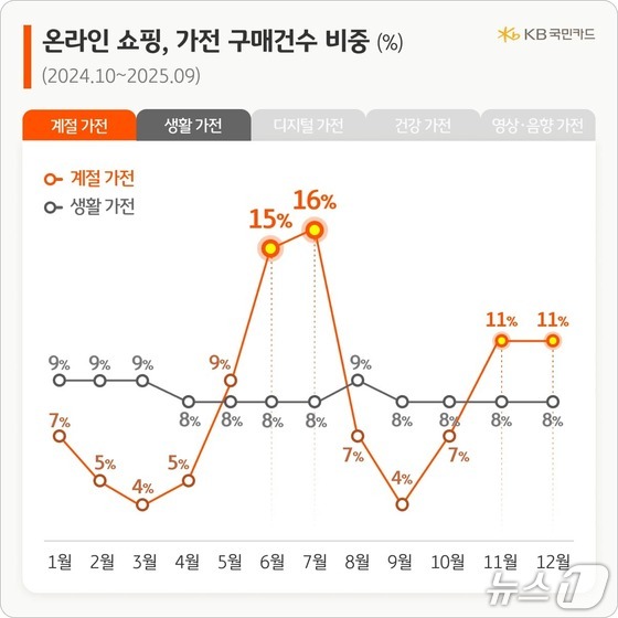KB국민카드는 온라인 쇼핑을 통한 가전 구매 소비 데이터를 분석한 결과 계절별로 뚜렷하게 품목별 수요 차이를 보이는 것으로 나타났다고 16일 밝혔다.