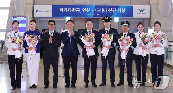 윤철민 파라타항공 대표이사(가운데)가 17일 인천국제공항 1터미널에서 열린 인천-나리타 신규 취항식에서 임직원들과 기념 촬영을 하고 있다. 파라타항공은 이날 인천-나리타 노선을 시작으로 첫 국제선 운항을 시작했다. 2025.11.17/뉴스1 © News1 박지혜 기자