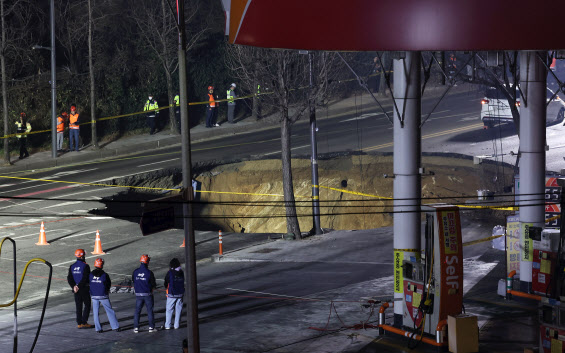 24일 서울 강동구 명일동 한 도로에 발생한 대형 싱크홀이 보이고 있다.(사진=뉴시스)