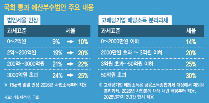 가장 주목받는 건 법인세 인상이다. 내년부터 법인세 세율은 모든 과세표준 구간에 걸쳐 1%포인트씩 일괄 인상된다. △2억원 이내 9→10% △2억~200억원 19→20% △200억~3000억원 21→22% △3000억원 초과 24→25% 등이다. 국회 논의 과정에서 구간별 차등 인상 논의가 나왔지만, 결국 정부안 그대로 모든 구간에서 인상하기로 했다.