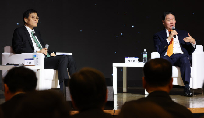 5일 서울 중구 대한상공회의소에서 열린 한국은행, 대한상공회의소 공동주최 ‘AI 기반의 성장과 혁신’ 세미나에서 최태원 대한상공회의소 회장(오른쪽)과 이창용 한국은행 총재가 특별대담을 하고 있다.(사진=연합뉴스)