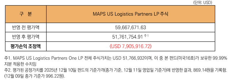 재평가 전 맵스 US 로지스틱스 파트너스 LP 주식의 평가액은 5966만7671.63달러였으나, 재평가 이후에는 5176만1754.91달러로 낮아졌다. 이에 따른 평가손익 조정액은 790만5916.72달러다.