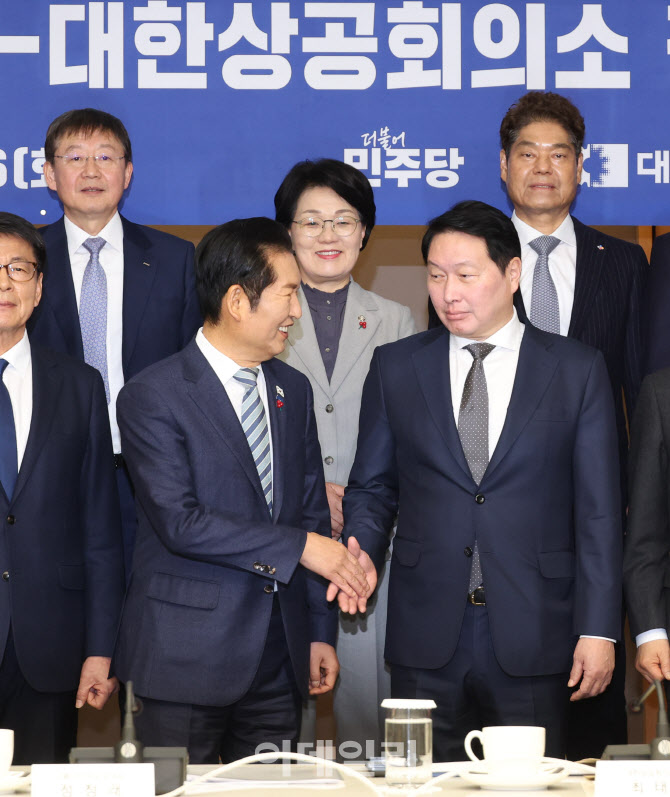 이날 간담회에는 민주당에서 정청래 대표를 비롯해 서삼석 최고위원, 한정애 정책위원장, 김원이 국회 산업통상자원중소벤처기업위원회 간사 등이 참석했다. 경제계에서는 최 회장을 비롯해 대한상의 회장단과 함께 삼성전자, SK, 현대차 등 주요 기업 고위 인사들이 자리했다.