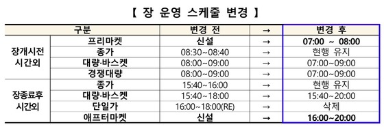 장 개시 전 시간 외 대량·바스켓·경쟁 대량 매매는 기존 오전 8시~9시에서 오전 7시~9시로 늘어난다. 장 종료 후 시간 외 대량·바스켓 매매도 오후 3시 40분~6시에서 오후 3시 40분~8시로 변경된다. 애프터마켓 운영에 따라 오후 4시~6시 단일가 매매는 사라진다. 장전 동시호가는 기존과 동일하게 오전 8시 30분부터 9시까지 진행된다.