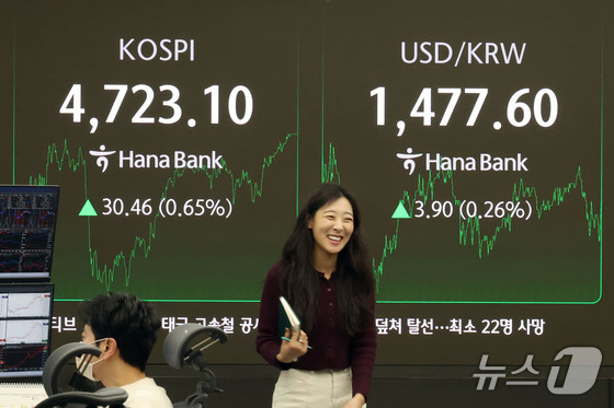 코스피 지수가 사상 처음으로 4700선을 돌파한 14일 오후 서울 중구 하나은행 본점 딜링룸 현황판에 전 거래일 대비 30.46포인트(0.65%)상승한 4,723.10을 나타내고 있다. 이날 원달러환율은 4.00원(0.27%)상승한 1,477.70원에 거래되고 있다. 2026.1.14/뉴스1 © News1 이광호 기자