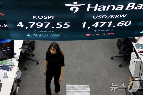 코스피가 10거래일 연속 상승하며 또다시 사상 최고치로 마감한 15일 오후 서울 중구 하나은행 딜룽룸 현황판에 전 거래일 대비 74.45포인트(1.58%) 상승한 4,797.55를 나타내고 있다. 이날 원달러환율은 전 거래일대비 5.90원(0.40%)하락한 1,471.60원에 거래되고 있다. 2026.1.15/뉴스1 © News1 이광호 기자