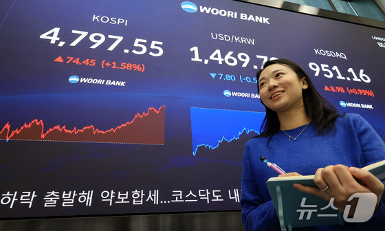 코스피가 10거래일 연속 상승하며 또다시 사상 최고치로 마감한 15일 오후 서울 중구 하나은행 딜룽룸 현황판에 전 거래일 대비 74.45포인트(1.58%) 상승한 4,797.55를 나타내고 있다. 2026.1.15/뉴스1 © News1 이광호 기자