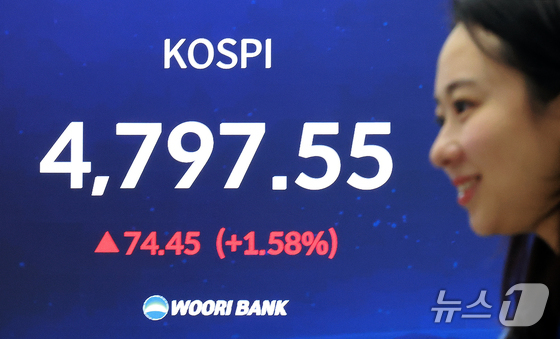 코스피가 연일 사상 최고치를 경신한 15일 서울 중구 우리은행 본점 딜링룸 현황판에 종가가 표시되고 있다. 이날 코스피는 전 거래일 대비 74.45포인트(1.58%)상승한 4,797.55로 장을 마쳤다. 2026.1.15/뉴스1 © News1 이호윤 기자