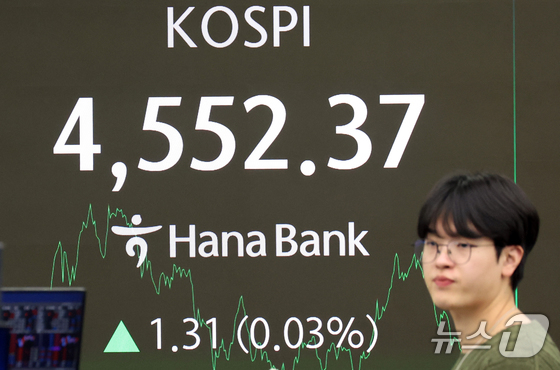 8일 오후 서울 중구 하나은행 본점 딜링룸 전광판에 증시 종가 시황이 나타나고 있다. 이날 코스피 지수는 전거래일 대비 1.31(0.03%) 포인트 상승한 4,552.37로, 코스닥지수는 3.33(0.35%)포인트 하락한 944.06으로 장을 마감했다. 2026.1.8/뉴스1 © News1 김명섭 기자
