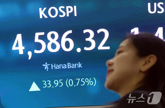 9일 오후 서울 중구 하나은행 본점 딜링룸 전광판에 증시 종가 시황이 나타나고 있다. 이날 코스피 지수는 전거래일 대비 33.95(0.75%) 포인트 상승한 4,586.32로, 코스닥지수는 3.86(0.41%)포인트 상승한 947.92로 장을 마감했다. 2026.1.9/뉴스1 © News1 김명섭 기자