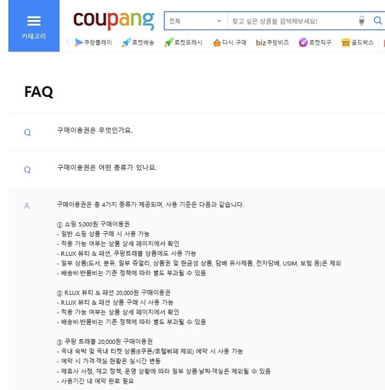 쿠팡 공지에 따르면 구매이용권 관련 사용 조건 안내만 22개다. 핵심적인 부분을 보면 쇼핑과 쿠팡이츠 5000원, R.LUX 뷰티&패션과 쿠팡 트래블 2만 원 등이다.
