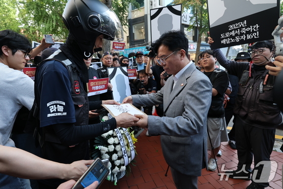 김영훈 고용노동부 장관이 지난해 서울 중구 민주노총에서 열린 간담회에 앞서 라이더유니온 조힙원들로부터 배달노동자 산재 사고 대책을 촉구하는 서한문을 전달받고 있다. © News1 오대일 기자