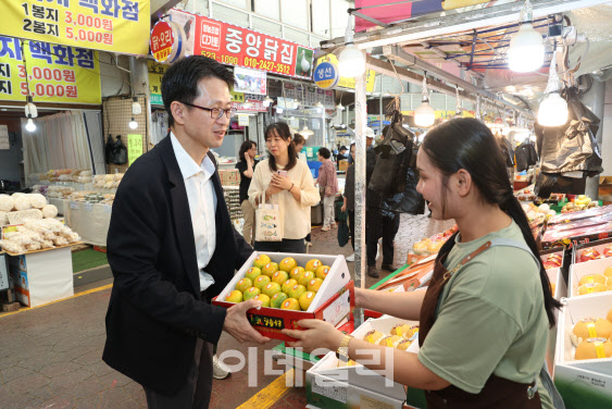 백승보 조달청장(왼쪽)이 대전 중구의 태평시장을 찾아 과일을 직접 구매하는 등 ‘지방살리기 상생소비’ 행사에 동참하고 있다. (사진=조달청)
