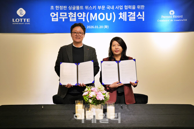 임형빈 롯데백화점 F&B 부문장과 김경연 페르노리카 코리아 마케팅 전무가 업무협약을 체결한 후 기념사진을 찍고 있다. (사진=롯데백화점)