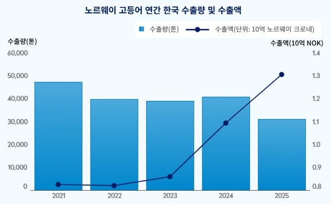 노르웨이 고등어 연간 한국 수출량 및 수출액 (그래픽=노르웨이수산물위원회 제공).