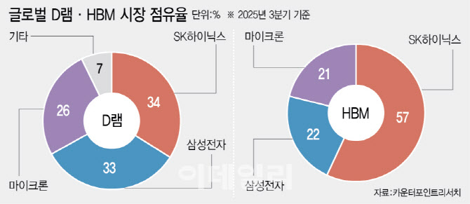 현재 글로벌 메모리 시장에서 삼성전자와 SK하이닉스의 지위는 여전히 견고하다. 시장조사 업체 카운터포인트리서치에 따르면 지난해 3분기 기준 글로벌 D램 시장점유율은 SK하이닉스 34%, 삼성전자 33%, 마이크론 26% 순이다. HBM시장에서는 SK하이닉스가 57%로 1위를 차지했고, 삼성전자 22%, 마이크론 21%가 뒤를 잇는다. 기술력과 주요 고객사인 엔비디아향 HBM 물량을 확보했음에도 생산능력 부족은 마이크론의 한계로 지적돼왔다.