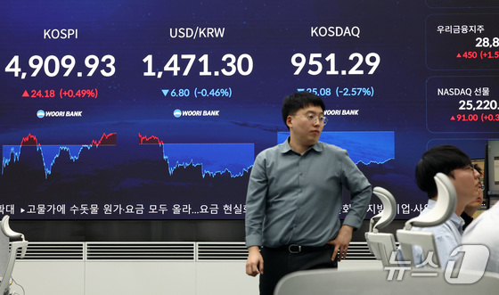 21일 오후 서울 중구 우리은행 본점 딜링룸 전광판에 코스닥 지수가 표시돼 있다. 2026.1.21/뉴스1 © News1 최지환 기자