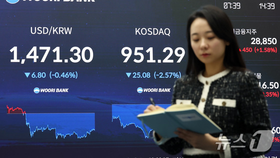 21일 오후 서울 중구 우리은행 본점 딜링룸 전광판에 달러·원 환율과 코스닥 지수가 표시되어 있다. 2026.1.21/뉴스1 © News1 최지환 기자