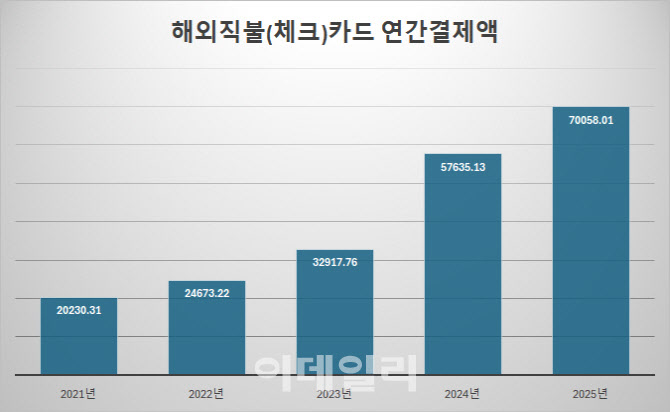 최근 5년(2021~2025년)간 해외 직불·체크카드 결제액 추이를 보면 코로나19 팬데믹 기간이던 2021년 2조 230억 3100만원에서 트래블카드가 본격 도입된 2022년 2조 4673억 2200만원으로 1년새 엔데믹 효과가 더해지며 20% 이상 늘었다. 이후 2023년 3조 2917억 7600만원, 2024년 5조 7635억 1300만원, 2025년 7조 58억 100만원 등 연평균 30% 넘는 증가세를 보이고 있다. 해외 신용카드 결제액 대비 직불·체크카드 결제액도 2022년엔 27%선에 그쳤지만, 2025년엔 절반 수준인 47%수준까지 늘었다.