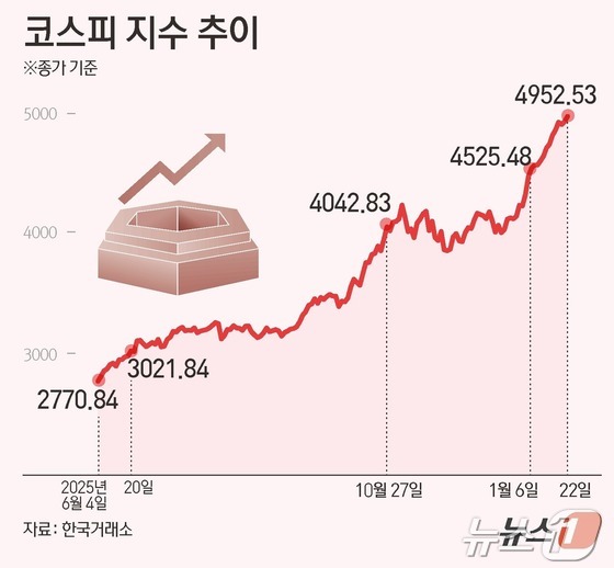 22일 코스피는 전일 대비 42.60포인트(p)(0.87%) 상승한 4952.53으로 거래를 마치며 사상 최고치를 경신했다. 장중에는 5019.54p까지 오르며 사상 처음으로 5000포인트를 돌파했다.