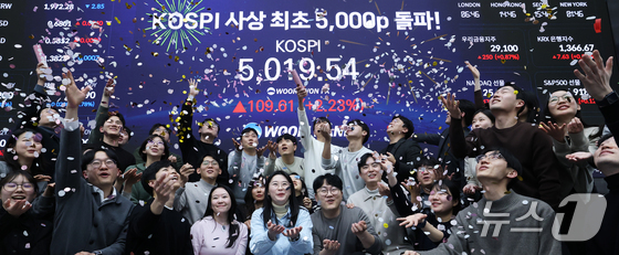 22일 서울 중구 우리은행 본점 딜링룸에서 직원들이 장중 최고가가 찍힌 전광판을 배경으로 코스피 5000 돌파를 축하하고 있다. 2026.1.22/뉴스1 © News1 오대일 기자