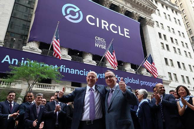 서클인터넷그룹의 CEO 제러미 알레어와 공동 창업자인 션 네빌이 지난해 6월5일, 회사의 뉴욕증권거래소 상장 당일 뉴욕시의 거래소 앞에서 포즈를 취하고 있다. (사진=로이터통신)