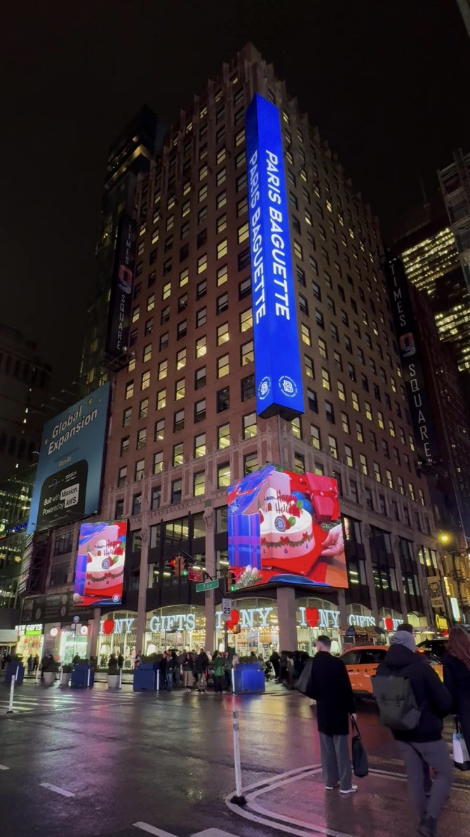 지난 해 12월 미국 뉴욕 타임스스퀘어 대형 전광판에 송출된 파리바게뜨 홀리데이 시즌 케이크 광고 영상(사진=파리바게뜨).