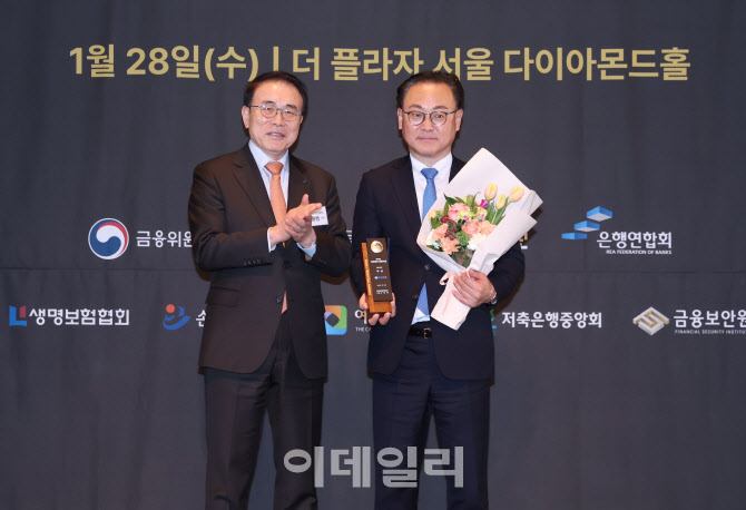 [이데일리 노진환 기자] 2026 이데일리 금융대상 시상식이 28일 서울 중구 더플라자호텔에서 열렸다. 전국은행연합회장상을 수상한 우리은행 배연수(오른쪽) 부행장(기업그룹장)과 시상자인 조용병 전국은행연합회장이 기념촬영을 하고 있다.
