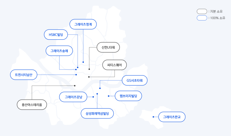 이 중 신한L타워, 씨티스퀘어, 용산 아스테리움은 신한알파리츠가 지분을 갖고 있으며 나머지는 신한알파리츠가 100% 소유한 자산이다.