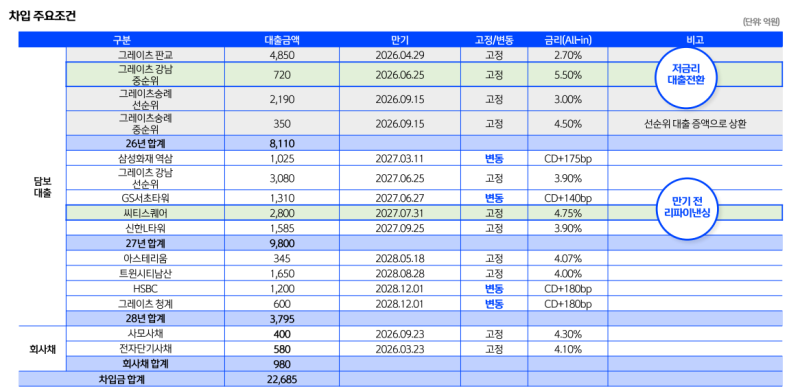 금융비용 절감 노력도 병행한다. 올해 만기가 다가오는 일부 대출의 경우, 과거 저금리로 조달된 자금이 많아서 최근 금리 수준(연 3.8~4.0%)을 고려하면 금리 상승이 불가피한 상황이다.