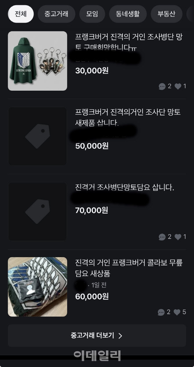 중고거래 플랫폼에서 프랭크버거의 조사병단 담요팩이 정가보다 높은 가격에 거래되고 있다. (사진=당근마켓 캡쳐)