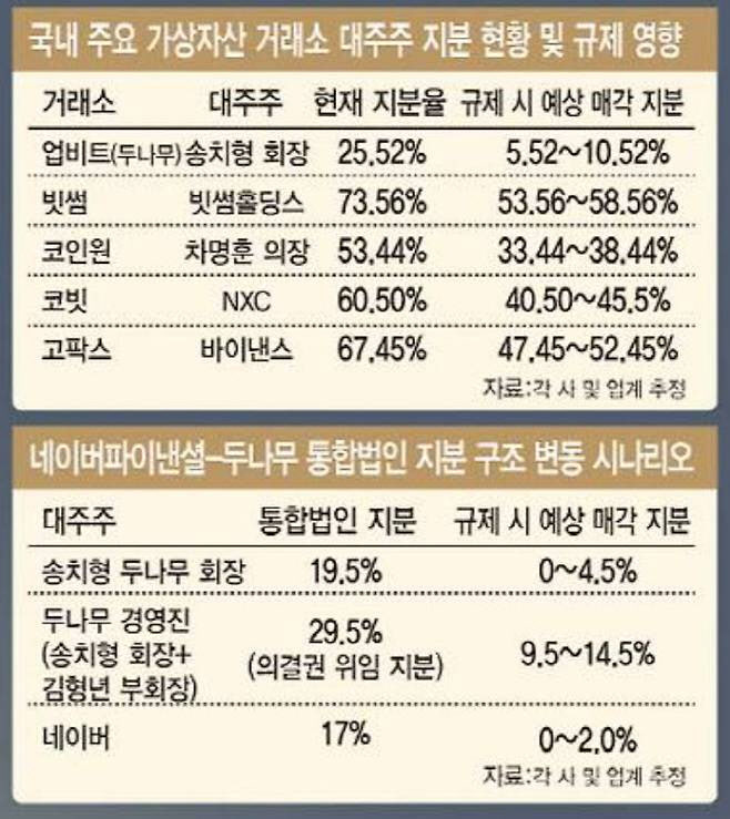 금융위원회의 15~20% 일률적 디지털자산거래소 대주주 규제가 시행되면 5대 거래소 대주주 모두 지분을 매각해야 한다. 지분율 제한은 두나무와 코빗 인수를 각각 추진하는 네이버와 미래에셋에도 영향을 끼칠 전망이다. (자료=각 사 및 업계 추정)