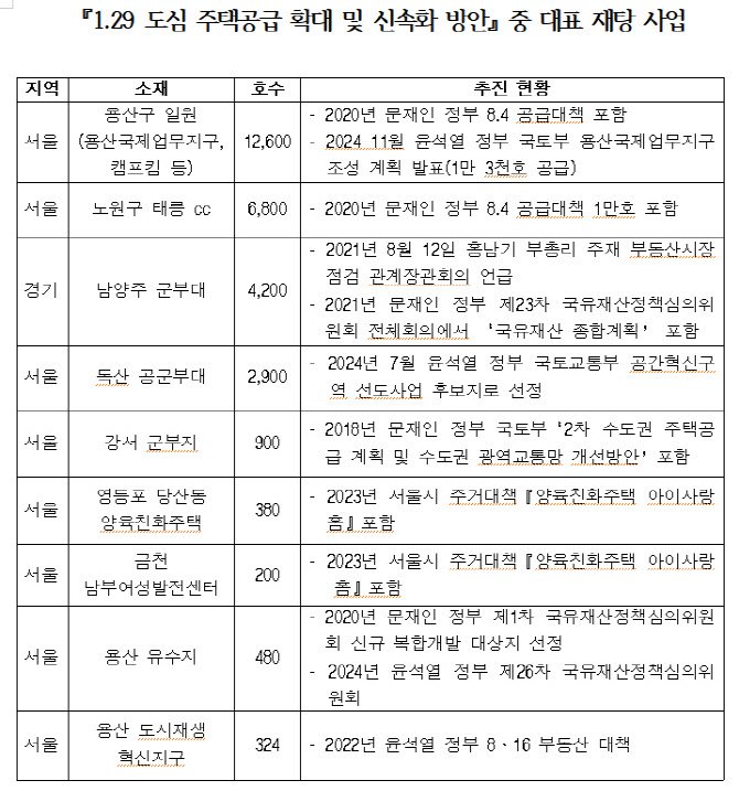 대표적으로 용산 캠프킴 부지가 꼽힌다. 문재인 정부가 2020년 8.4대책을 통해 3100가구를 공급하겠다고 밝힌 바 있다. 윤석열 정부 역시 2022년 공공분양 주택계획에 해당 부지를 포함시켰다. 태릉CC 부지 역시 2020년 8.4 대책에 포함됐으나 주민 반대로 사업이 무산된 바 있다.