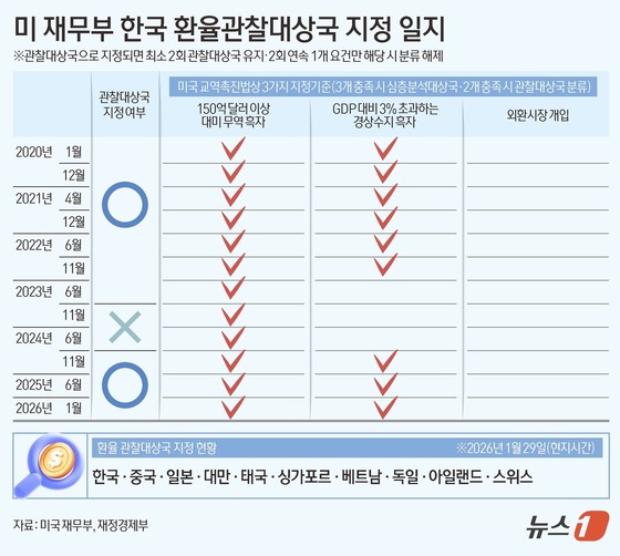 한국은 3개 요건 중 대미 무역흑자와 경상수지 흑자 등 2개 요건을 충족해 2024년 하반기 이후 3회 연속 관찰대상국으로 분류됐다.