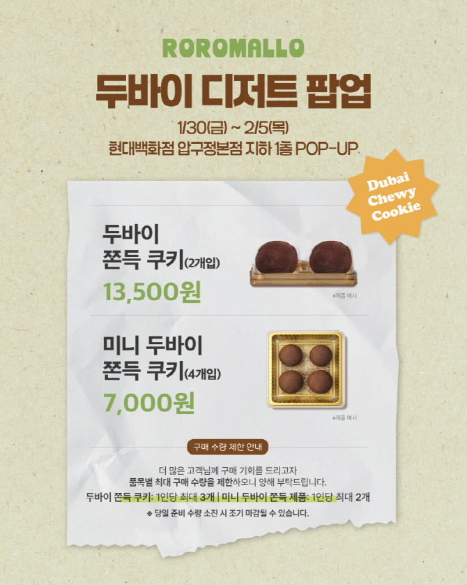 [이데일리 이윤정 기자] ‘아이스 생초콜릿 두바이 스타일’, ‘두바이 쫀득 쿠키’ 등을 연달아 출시하며 두바이 디저트 열풍을 주도하는 로로멜로가 오는 1월 30일부터 2월 5일까지 현대백화점 압구정본점에서 팝업스토어를 진행한다. 이번 팝업스토어는 온라인과 편의점에서 큰 인기를 끌었던 로로멜로의 두바이 디저트 라인업을 오프라인에서 직접 만나볼 수 있는 기회다.