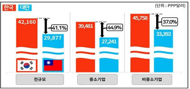 대만과 비교할 때 대졸 초임 평균은 우리나라 4만2160달러(구매력 평가환율을 기본으로 하되 시장환율 기준을 병기해 일본 비교시와 차이), 대만 2만9877달러로 우리가 대만보다 41.1% 높았다. 규모별로는 중소기업에서 우리(5~99인)가 대만(1~199인)보다 44.9% 높고, 비중소기업에서 우리가 대만보다 37.0% 높게 나타났다. 2025년 1인당 국내총생산(GDP)가 대만이 우리를 추월한 가운데(2025년), 시장환율 기준으로는 우리 대졸 초임이 대만의 거의 두 배에 달하는 것으로 분석됐다.