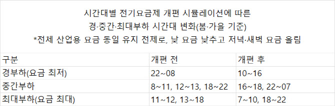 1일 이데일리가 전력거래소의 2024년 시간대별 전력거래량과 현 산업용 요금 구조, 정부의 제도 개편 취지를 고려해 새 산업용 계절·시간별 요금제를 시뮬레이션해본 결과, 평일 주간(9~18시)에 조업이 집중된 중소기업의 경우 연평균 전력량요금 단가가 1킬로와트시(㎾h)당 115.6원에서 89.1원으로 약 23% 내리는 것으로 분석됐다. 이와 대조적으로 주 7일 24시간 가동하는 대형 사업장의 경우 현 131원에서 133~137원으로 1~4%가량 올랐다.