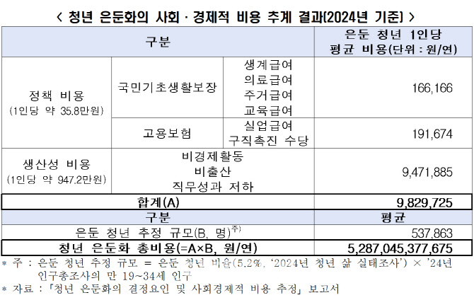이번 보고서는 청년 은둔으로 인해 비은둔 상태와 비교해 우리 사회·경제가 추가로 부담하는 비용을 추산했다. 청년층의 은둔 비율 수치를 바탕으로 한 결과 2024년 기준 은둔 청년 1인당 연간 약 983만원의 비용이 더 발생하는 것으로 분석됐다. 이를 전체 은둔 청년 규모로 환산하면 연간 사회·경제적 비용은 약 5조3000억원에 이른다.