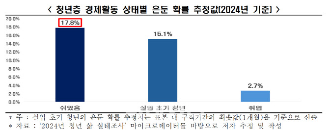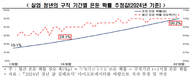 특히 실업청년의 구직기간이 길어질수록 은둔 확률은 더 빠르게 상승하는 경향을 보였다. 보고서는 “구직 1개월 차 실업 청년의 은둔 확률은 약 15.1%이며, 구직기간이 길어져 14개월에 이르면 약 24.1%로 상승하고, 3년6개월(42개월)이 지나면 은둔 가능성이 50%를 상회한다”고 설명했다. 이에 따라 장기 실업 상태에 놓인 청년들에게 취업 지원과 함께 은둔화 예방 대책을 병행할 필요가 있다는 의견이다.