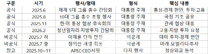 이재명 대통령 작년 6월 취임 이후 대통령과 주요 그룹 총수들의 만남이 눈에 띄게 잦아졌다. 4일 청년 일자리와 지방 투자 확대를 위한 기업 간담회까지 공식 일정만 네 차례, 비공식 오찬과 개별 회동까지 합치면 이재용 삼성전자 회장과 정의선 현대자동차그룹 회장은 작년 6월 이후 이 대통령을 만난 횟수가 알려진 것만 여섯 번이다.