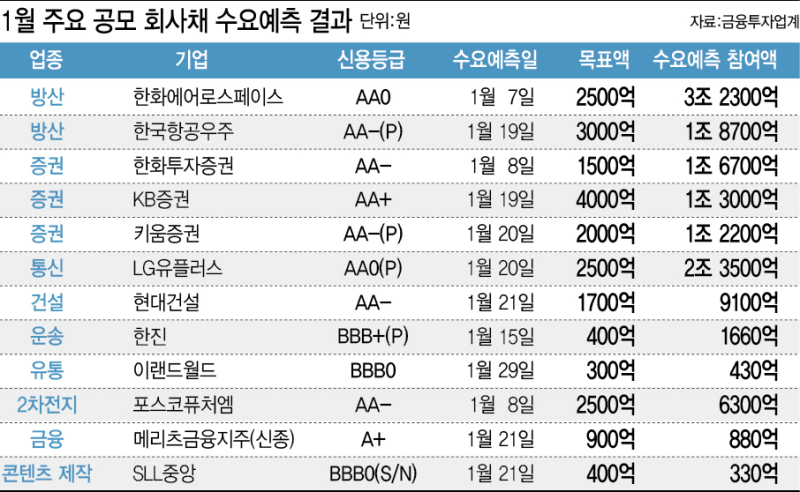 1월 초 회사채 시장은 지난해 말까지 이어졌던 금리 불안이 다소 진정되며 비교적 안정적인 흐름을 보였다. 이러한 분위기 속에서 올해 회사채 시장의 포문을 연 한화에어로스페이스(AA0)는 수요예측 흥행을 이끌었다. 한화에어로스페이스는 2500억원 규모 수요예측에서 3조2300억원의 주문을 확보하며 발행 규모를 5000억원으로 증액했다. 2·3·5년물 모두 민평 대비 마이너스 금리에서 조건을 확정지으며 방산 업종에 대한 높은 기대를 입증했다.