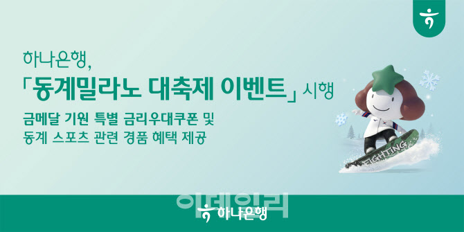하나은행은 이번 이벤트에 참여한 손님 중 추첨을 통해 △팀 코리아 선수복(3명) △겨울용 패딩 장갑(5명) △겨울용 비니(5명) 등 동계 스포츠 시즌과 어울리는 다양한 경품을 제공할 예정이다. 이벤트에 관한 자세한 내용은 하나은행 대표 모바일 앱 ‘하나원큐’ 또는 하나은행 고객센터에서 확인할 수 있다.