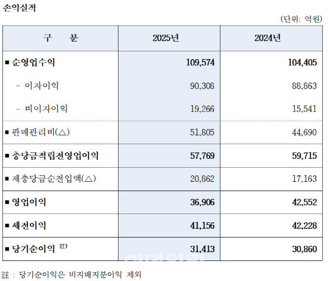 그룹 자기자본이익률(ROE)은 전년과 유사한 9.1%를 기록했다. 판매관리비는 명예퇴직비용 기저효과, 보험사 인수 및 디지털·IT 등 미래성장 투자 등으로 증가했으나, 채널 효율화와 전 그룹사의 비용관리 노력을 통해 판관비용률은 45% 수준에서 관리됐다. 여기에 우리은행은 당기순이익 2조 6066억원을 기록했다.