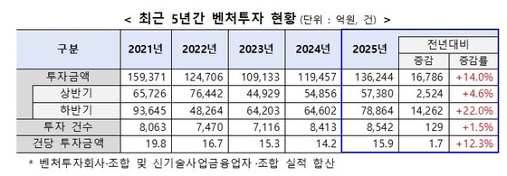 13일 중소벤처기업부에 따르면 2025년 신규 벤처투자 금액은 13조 6000억 원으로 전년 대비 1조7,000억 원(14.0%) 증가했다. 2021년(15조 9000억 원)에 이어 역대 두 번째 규모다.