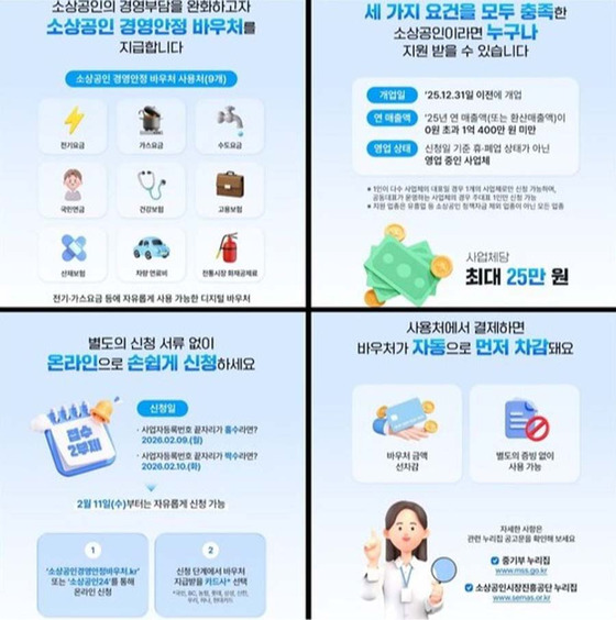 정부는 상담 창구도 확대했다. 바우처 전용 콜센터와 소상공인시장진흥공단 콜센터, 전국 78개 지역센터에서 △신청 자격 △신청 방법 △사용 가능 항목 등을 안내하고 있다.