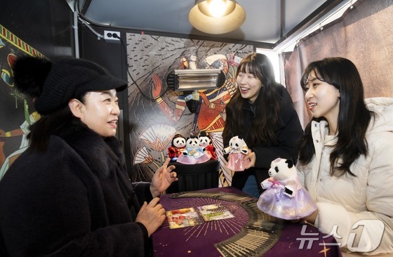 사진은 에버랜드 타로점에서 모델들이 신년 바오패밀리 굿즈와 함께 타로를 체험하고 있는 모습. (삼성물산 제공. 재판매 및 DB 금지) 2026.1.26 © 뉴스1