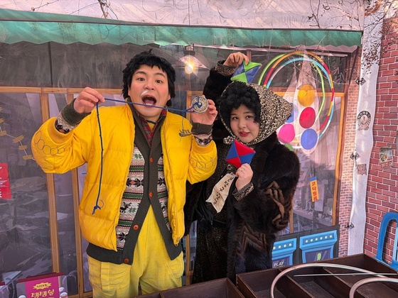 설 연휴를 앞둔 12일 부산 기장군 롯데월드 어드벤처 부산에서 한복을 입은 모델들이 제기차기를 즐기고 있다. 롯데월드 어드벤처 부산은 설 연휴 기간인 오는 14일부터 18일까지 로얄가든 광장에서 '설날 민속놀이 한마당'을 진행한다. 2026.2.12 © 뉴스1 윤일지 기자