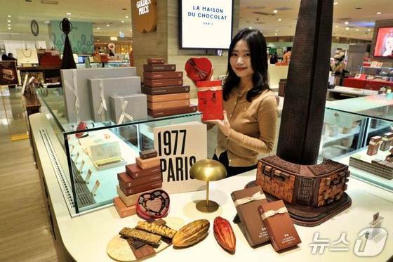 롯데백화점 본점 지하 1층 라메종뒤쇼콜라 매장에서 모델이 초콜릿 선물세트를 홍보하고 있다.(롯데백화점 제공)