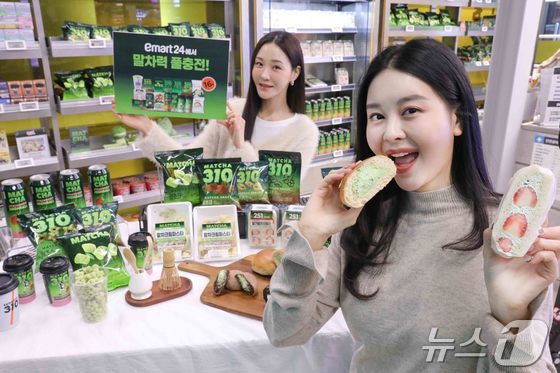 이마트24가 계속되는 말차코어 열풍 속 디저트와 컵커피·즉석커피, 간편식과 과자·아이스크림, 하이볼 등 다양한 카테고리에서 말차 단독 차별화상품 16종을 대거 출시하며 젊은층 공략에 나선다고 19일 밝혔다. 사진은 이마트24 트렌드랩 성수점에서 모델들이 말차 신제품 16종을 소개하는 모습. (이마트24 제공. 재판매 및 DB 금지) 2026.1.19 © 뉴스1